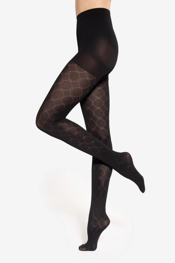 Rajstopy Modeline 7 posiadają modelującą część majteczkową, która podnosi linię pośladków, a także wyszczupla okolice brzucha. Ich motywem przewodnim jest geometryczny wzór rombów. 40 DEN