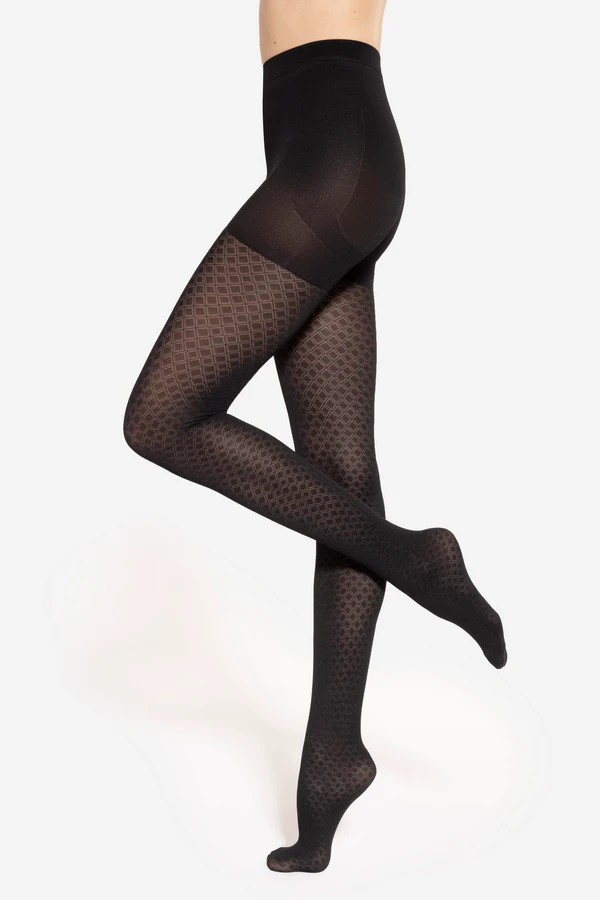 Rajstopy Modeline 8 posiadają modelującą część majteczkową, która podnosi linię pośladków, a także wyszczupla okolice brzucha. Ich motywem przewodnim jest geometryczny wzór rombów. 40 DEN